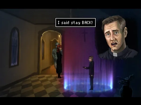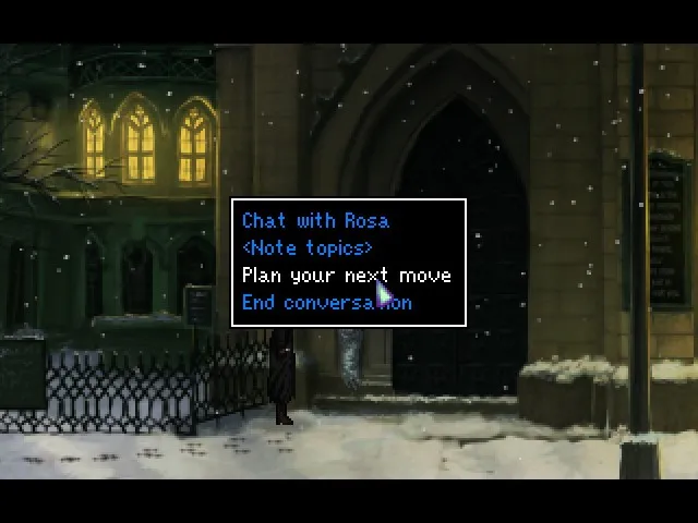 Подуйте на записку ещё раз, чтобы подтолкнуть её к Розе. Переключитесь на Розу и поднимите записку. Поговорите с портье ещё раз. Спросите его по всем темам, а потом используйте варианты из раздела «Notes» (ваших пометок в блокноте). Спросите его о Грэйс (Grace) и узнаете, что это не имя, а название церкви (Grace Church). Отправляйтесь в эту церковь.