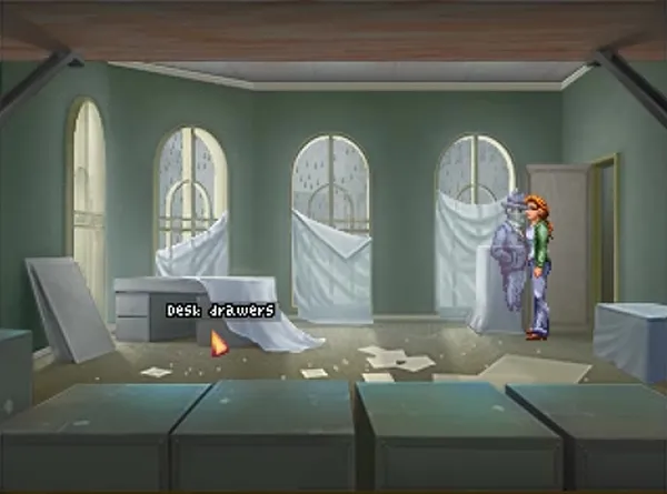 Переключайтесь на Розанжелу и используйте скрепку на дверь. Теперь вы наконец попали в комнату. Осмотрите стол, а затем откройте ящик в нём. Внутри Роза найдёт некролог о кончине некоего Аллена Райкина (Allen Reiken). После чего в блокноте появится пометка о нём. Кликните на ткань, занавешивающую окна. Роза уберёт её.