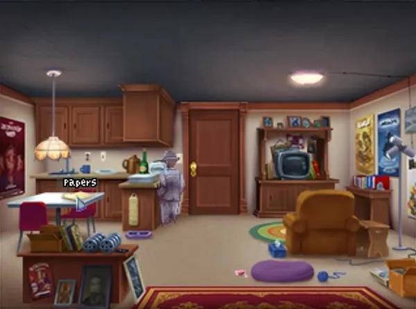 Теперь нужно осмотреть помещение. Видите на полу что-то блестящее? Кликните на предмете правой кнопкой и узнаете, что это скрепка. Кликните на неё левой кнопкой — Джоуи вызовет лёгкий ветерок (максимум на что он способен в реальном мире) и сдует её под дверь. Там её автоматически подберёт Розанжела.