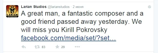 Эту печальную новость о своём сотруднике и друге первыми сообщили сами Larian Studios в своём твиттере.