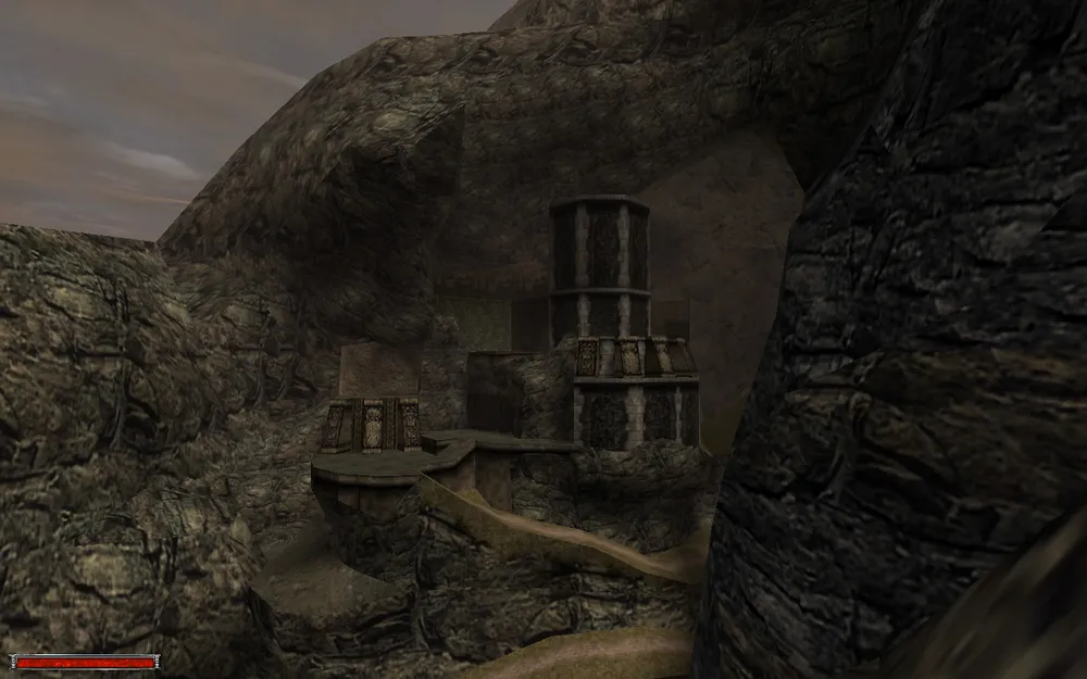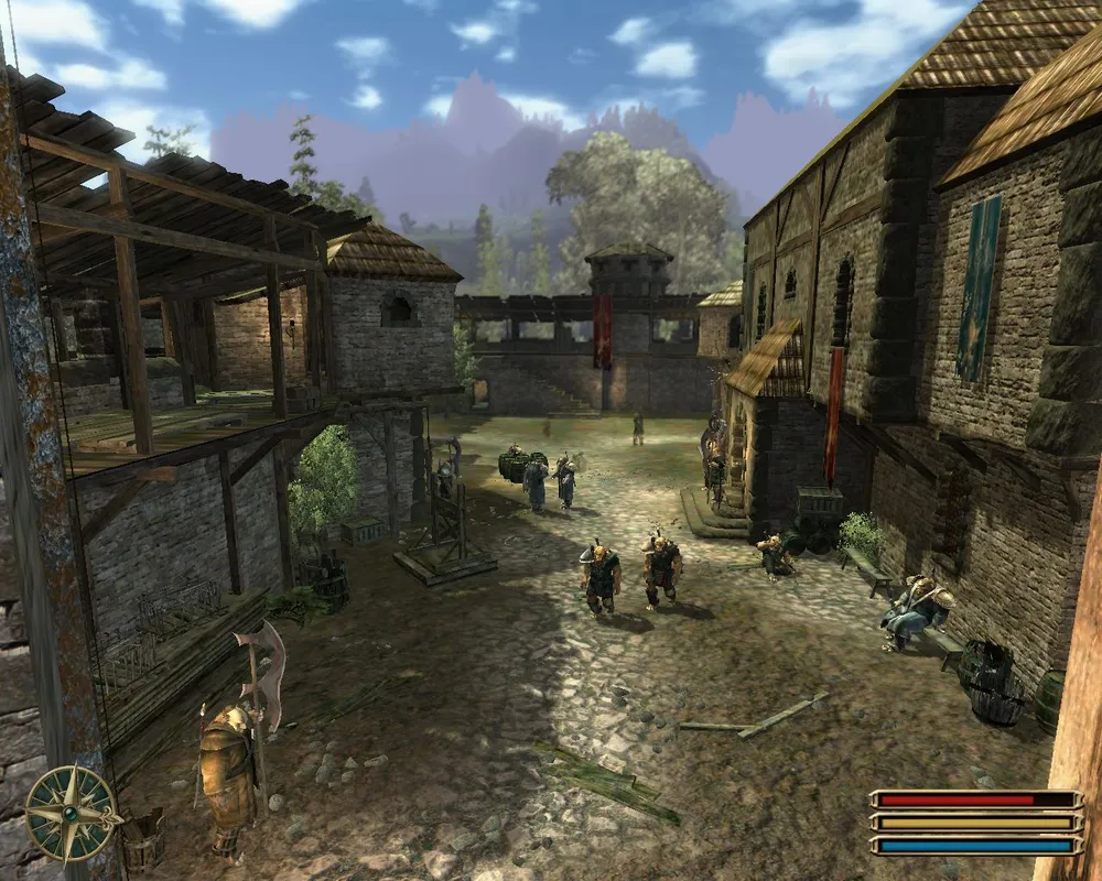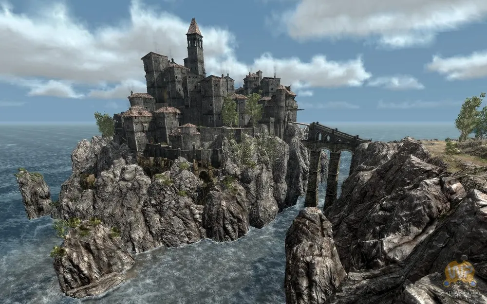 Как мы видим, здесь изображена некая крепость в горах. Теперь смотрим памятное место из незабвенной Готики 1. Именно сюда в своё время мы ходили в поисках Юнитора для магов воды. На узком мостике стоял каменный голем, а в форте водились гарпии. И помогал нам один из известной четвёрки друзей героя – Лестер, искавший там выгодный для себя старинный документ, дающий права на владения Фортом.