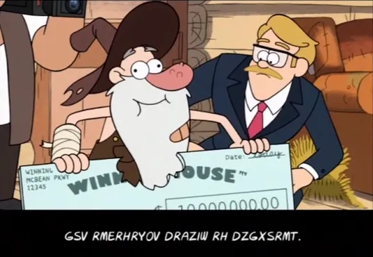 Начиная с 7-й серии, новые фразы закодированы методом Атбаш (ГУГЛИТЕ). В шифре Атбаш буквы заменяются аналогичными с другого конца алфавита. A становится Z, B-Y, C-X и так далее. (Ломайте систему, дочитывайте абзацы до конца...)