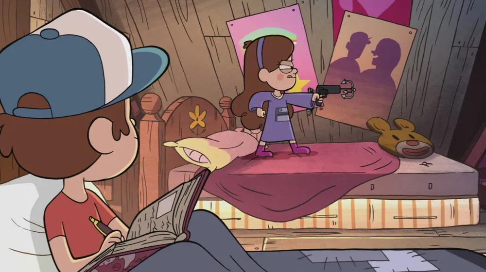 Поза, в которую становится Мэйбл, взяв пистолет с крюком — отсылка к игре Legend of Zelda... Какая именно поза я не знаю, так как я не играл в это... (Но спасибо одному человеку за инфу...мда.)