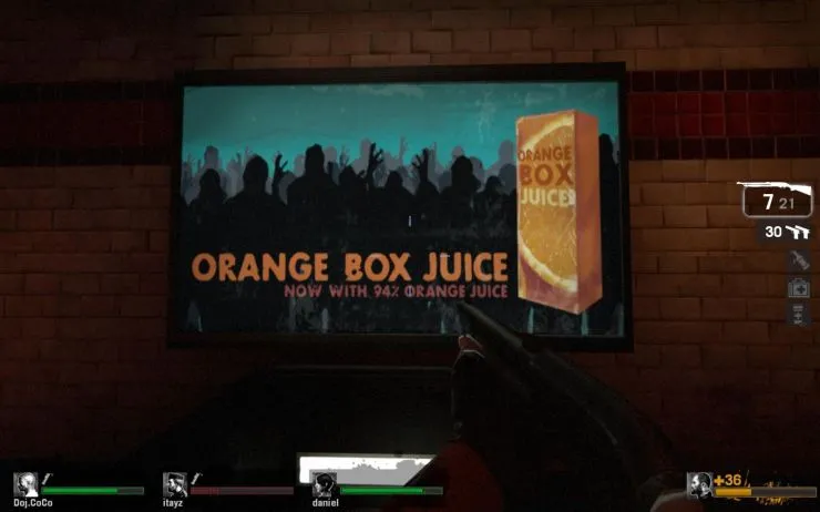 В игре есть плакаты, рекламирующие сок Orange Box, что является отсылкой к играм компании Valve: HL2: Episode Two, Portal и Team Fortress 2, выпущенных в едином наборе Orange Box.
