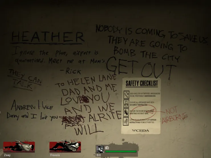 Всё-таки то, что создатели Left 4 Dead имеют отношение к разработке одной из самых популярных сетевых игр последних лет, не мог не сказаться на игре. Если, играя Луисом, вы подберёте Узи, то вам может посчастливиться услышать фразу "Прямо как в Counter-Strike!". Отдельно её можно найти среди игровых файлов: sound/player/survivor/voice/Manager/Takesubmachinegun03.wav