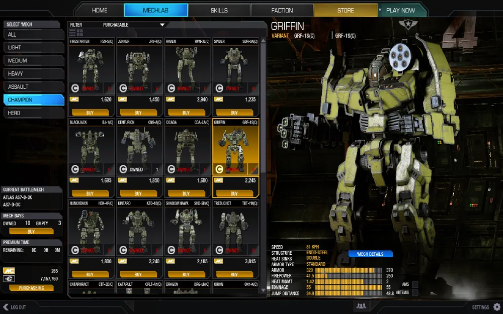 В MWO изначально ограничены 4 слотами в ангаре. Склад-mechlab с техникой исследовать не надо, но купить для игры можно только 4 машины. Если хочется пробовать другую модель, можно покататься на триальных версиях, но вот чтобы полноценно настраивать оснастку и опыт для покупки навыков - это уже надо или продать менее симпатичную и покупать желаемое, либо платить валюту за новое место в ангаре под мех.