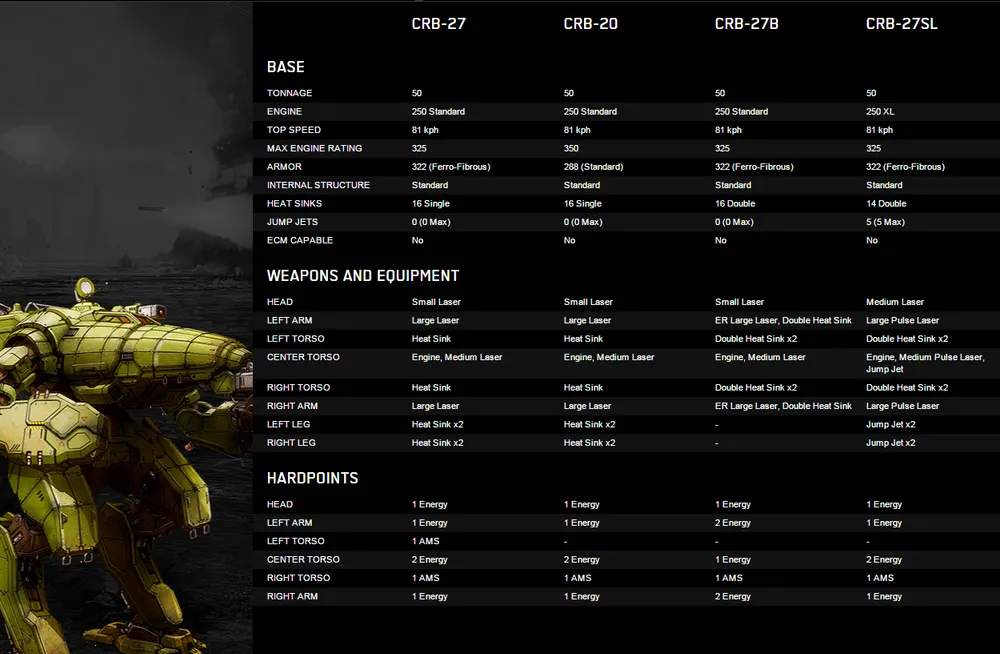 Средний мех созданный в последние дни Звёздной Лиги для участия в рейдах или партизанских операциях, чему способствовало его полностью энергетическое оружие. Несмотря на отсутствие актуаторов в руках и прыжковых двигателей, мех обладал высокой скоростью при движении по любой местности, мощным вооружением и крепкой бронёй. "Простой как топор" мех снискал любовь техников затрачивавших на работу с ним вдвое меньше времени чем с другими мехами. Светлое будущее и роль основного среднего меха Звездной Лиги накрылись медным тазом, практически сразу после Заговора Амариса. На начало войны было произведено всего около 1000 этих мехов, а завод по их производству был разрушен в Первой войне за наследие. К счастью, техники смогли наладить производство запасных частей, а со временем, и упрощённых моделей CRB-20, лишённых продвинутого бронирования и систем связи. К концу Четвёртой войны за наследие эти мехи были на грани исчезновения - на ходу оставалось меньше сотни - однако, вторжение кланов вдохнуло новую жизнь в этих мехов, заставив КомСтар открыть склады на которых прятали запасы времён Звёздной Лиги, включая Крабов. Передача этих мехов вкупе с изучением данных Ядра Хельма, позволили модернизировать оставшиеся модели и наладить производство точных копий CRB-27 времён Звёздной Лиги.