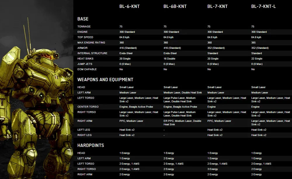 Тяжёлый мех, появившийся на заре становления Звёздной Лиги и принимавший активное участие в Войне воссоединения. Поставлялся одновременно для использования непосредственно на фронте и как командный мех до уровней батальонов. На момент создания в нём использовались наиболее продвинутые материалы и системы связи, что позволяло им объединяться в единую сеть и лучше взаимодействовать друг с другом. Мех обладает весьма солидным вооружением состоящим из РРС, 2 больших лазеров, 4 средних лазеров и 1 лёгкого лазера соединённого с BAP и выполнявшего скорее роль сканера, чем оружия. Для контроля нагрева использовались 20 одинарных теплоотводов, и их возможностей не всегда хватало: особенно неопытным мехвоинам, попадавшим в затруднительные ситуации. Специально для элитных подразделений поставлялись специальные модификации, снабжённые двойными теплоотводами, большими импульсными лазерами и ERPPC увеличенной дальности. К сожалению, спустя всего пару десятилетий после распада Звёздной Лиги, завод по производству Black Knight был полностью разрушен, осталось лишь производство низкоуровневых запасных частей. К 31 веку модели Black Knight практически исчезли, а оставшиеся уже мало чем напоминали оригинальные машины, поскольку для ремонта приходилось использовать всё что было под рукой. Тем не менее к битве за Токкайдо КомСтар смог достать из резервов и переоборудовать для решающего сражения достаточно большое их количество, чтобы снабдить ими офицерский и командный состав.