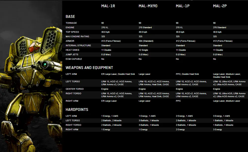90 тонн позитива и гигантские мишени для противника в одном комплекте. Один из самых противоречивых штурмовых мехов с крайне запутанной историей. Производился Синдикатом Дракона с конца 3030-х. Мех обладает довольно скромным бронированием и боекомплектом, зато его вооружение позволяет справиться даже с самым серьёзным противником на огромном расстоянии, не оставляя даже шанса подойти близко. Первая попытка создания этого меха, тогда ещё называвшегося Дабоку, оказалась крайне неудачной. Мех был крайне опасен. В первую очередь для своего пилота, так как было неизвестно какая система откажет и не отправится ли пилот в последний полёт над полем боя на своём кресле-катапульте в самый неподходящий момент. Во вторую очередь для союзников, поскольку система целеуказания была, мягко говоря, ненадёжной. И только в третью, для противника, и то лишь до тех пор пока система CASE не решала сбросить боекомплект из-за вмятины на грудной броне. Меха преследовала настолько дурная слава, что доработанный вариант получил новое обозначение и имя MAL-1R Mauler в надежде избежать её влияния... Обновлённый мех использовал оборудование и вооружение, основанные на технологиях Звёздной Лиги, что позволило повысить эффективную дальность и огневую мощь на дальних дистанциях и, наконец, решить проблемы с постоянным перегревом и бронированием.