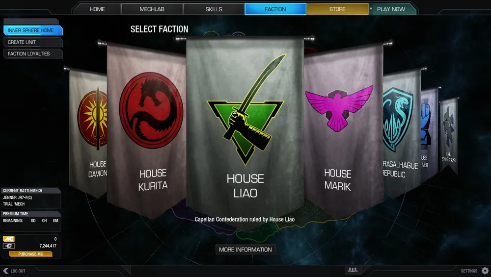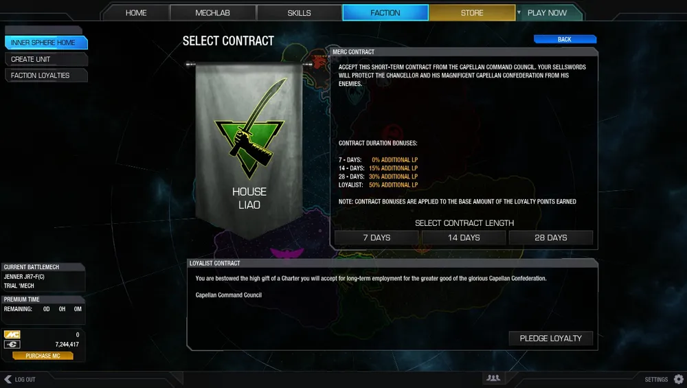 Фракции были сброшены вместе с патчем - ранее выбранные вами фракции теперь не активны. Как только авторизуетесь в игру, направляйтесь на экран фракций для выбора контракта. Есть контракты сроками на 7, 14, 28 дней. Хардкорные игроки могут присягнуть фракциям навсегда. Чем дольше контракт, тем выше награда, но и выше штраф за досрочный разрыв контракта. После того, как выберете фракцию, получите доступ к экрану Внутренней Сферы. Здесь вы найдёте список планет, которые можете атаковать или защищать. Так что присоединяйтесь к фракции и начинайте сражение за территорию.