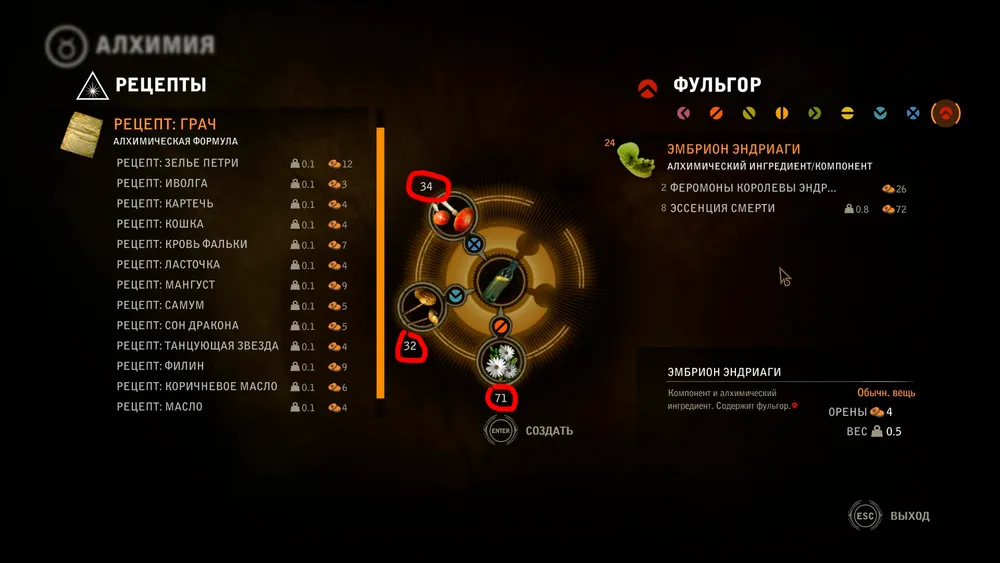 Алхимия: красным отмечено, какое количество каждого из необходимых ингредиентов осталось.