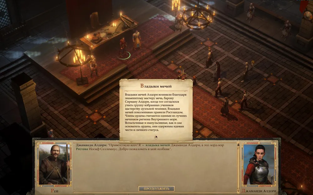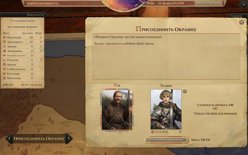 Зато я смог увидеть второй слой игры - стратегический. Эта сторона Pathfinder: Kingmaker открывается после присуждения баронского титула и обретения власти над собственными владениями. Тут-то игра раскрывает новую глубину и разнообразие геймплея, что поневоле забываешь о партийной ролевой части. Хочется сидеть в своей резиденции и проматывать время, наблюдая как выполняются приказы, отстраиваются здания в поселении и развивается владение. Но нет, на самом деле задача игрока не сводится к превращению в феодального менеджера: по-прежнему можно продолжать героические путешествия своей партией, прокачивать героев и собирать артефакты, выполнять квесты. Просто теперь задачи связаны с обеспечением благополучия своим владениям. Периодически надлежит возвращаться в свою резиденцию, чтобы принимать посланцев, ожидающих аудиенции для решения каких-то вопросов. Кстати, выясняется новая польза от сопартийцев - их можно назначать на посты своих помощников по управлению владениями.