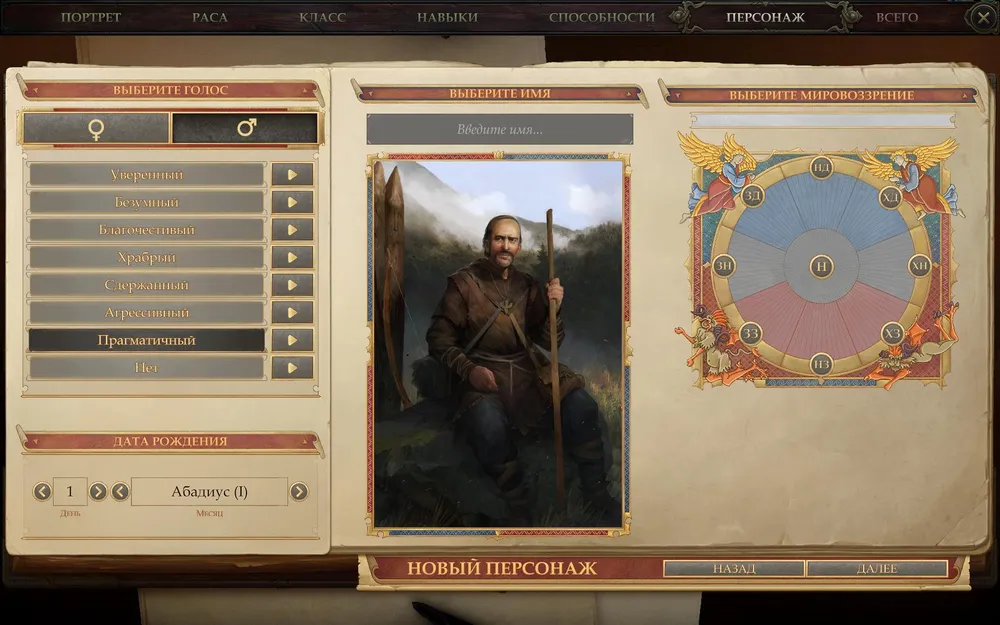 Ещё один непростой вопрос - выбор мировоззрения. Лично мне непривычно, что в ДнД-подобных играх надо с самого начала определять наклонности своего персонажа в вопросах морали, добра и зла. Мне всегда больше нравилась ситуация подобная Fallout: начинать героем нейтрального характера и постепенно, своими поступками и выборами по ходу прохождения сюжета и выполнения поручений обитателей мира, лепить из него добряка или плохиша. Плюс к этому зарабатывается репутация и степень известности в мире. Но в Pathfinder: Kingmaker требуется указать мировоззрение героя.