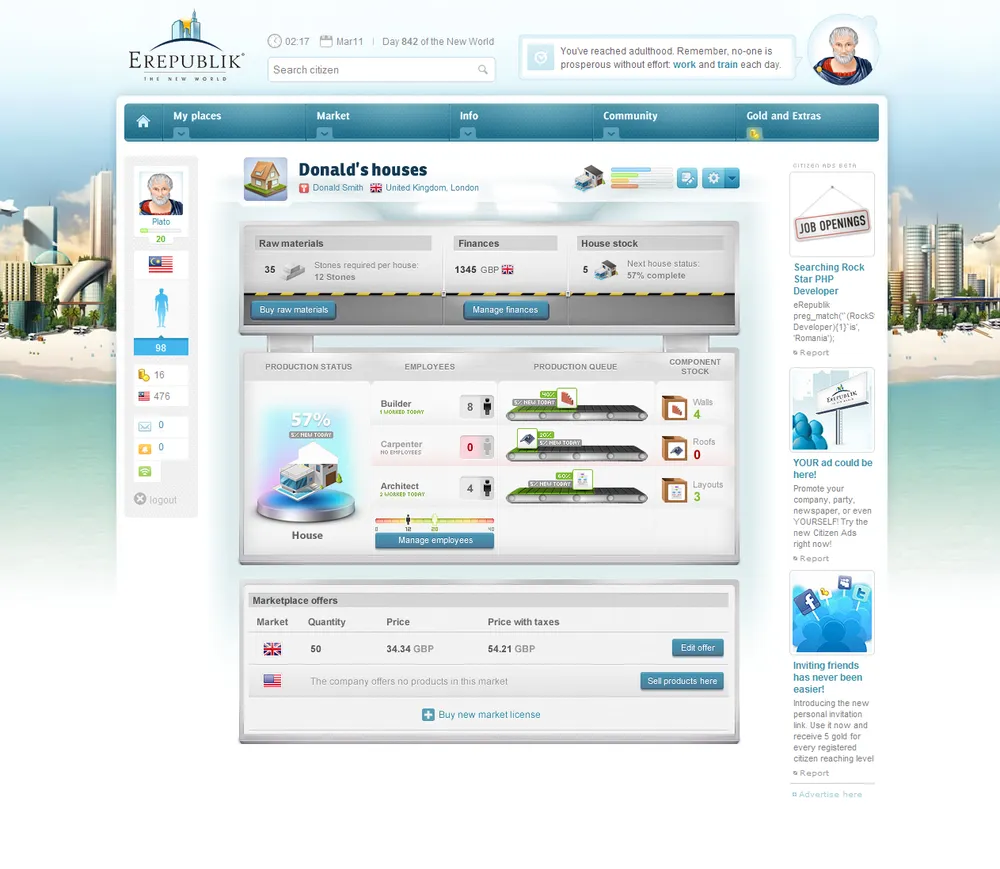 Итак, что же нового будет в новом экономическом модуле? Нам уже известно об управлении временем, адаптации (настройке свойств) продукции, новых отраслях и новых профессиях . Каждое из этих основных понятий обогащает геймплей ERepublik рядом новшеств. Давайте рассмотрим их еще раз.