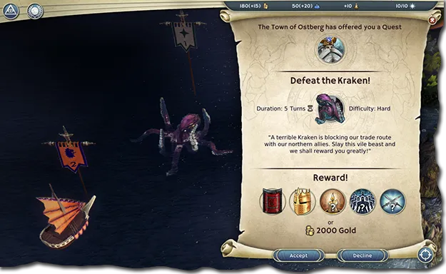 Вы можете получать квесты где угодно, но лучше всего их получать в независимых городах или жилищах. Квесты в качестве награды предлагают какие-либо тактические преимущества. Квесты также обогащают игру историями. Для каждой расы есть свои типы квестов. Они подталкивают игрока к исследованию мира, строительству городов и так далее. Каждый раз когда Вы загружаете новую карту, квесты обновляются.