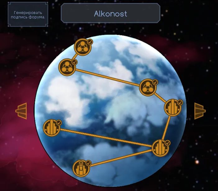 Алконост (Alkonost) - четвертая планета игры. Она подобна современной Земле с большими массами облаков. Но поверхность её суши, покрытая местной травой, занимает меньший процент поверхности, так что планета имеет больше океанов. Вода в этих океанах загрязнена ураном. Виды растений на планете - подобные земным видам.