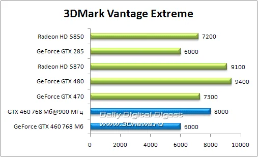 На стандартных частотах GeForce GTX 460 768 Мб показывает схожее с GeForce GTX 285 быстродействие. С разгоном по ядру до 900 МГц герой текущей заметки уже уверенно обходит GeForce GTX 470. При этом GeForce GTX 460 768 Мб будет стоить около 30.