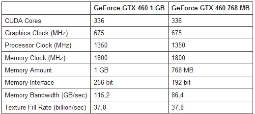 Наши немецкие коллеги подтверждают эти данные и приводят сравнительную табличку с характеристиками GeForce GTX 460 1024 Мб и GeForce GTX 460 768 Мб.