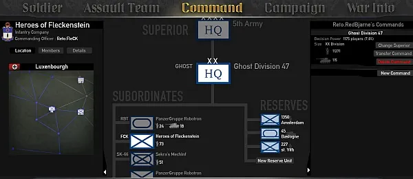 Фактически управление несколько "перевернуто". Игроки не набирают очки опыта, для того чтобы добраться до определенного ранга командира, они сами назначают на командную должность других игроков из своего подразделения. Таким образом игроки, в принципе, свободны организовывать свою армию, как вздумается. Я полагаю, мы вероятно видели бы различные команды с каждой стороны (Ось или Союзники), поскольку мы не ожидаем, что все игроки будут в состоянии найти согласие, но очевидно, что у команды, которая знает как организовать себя, будет явное преимущество перед разрозненной командой.