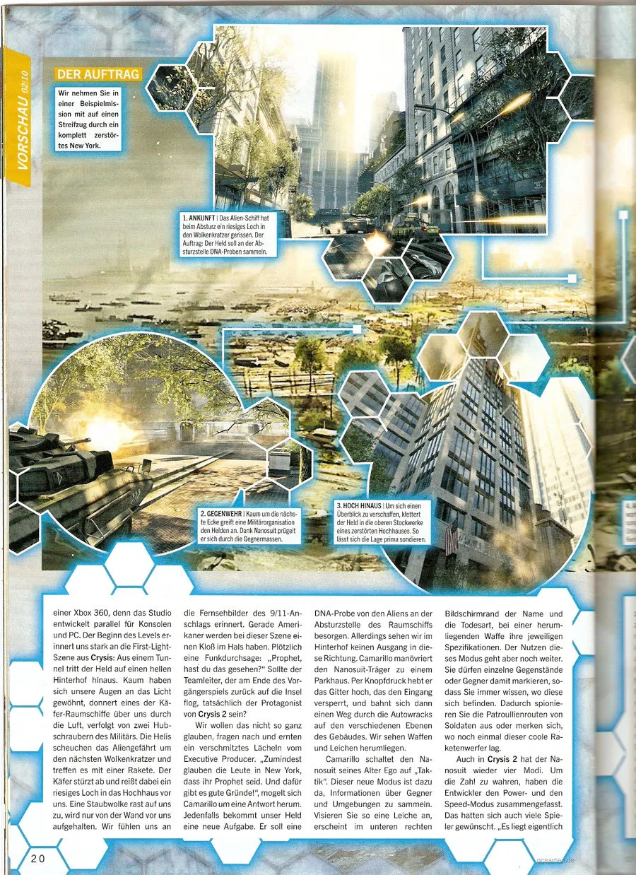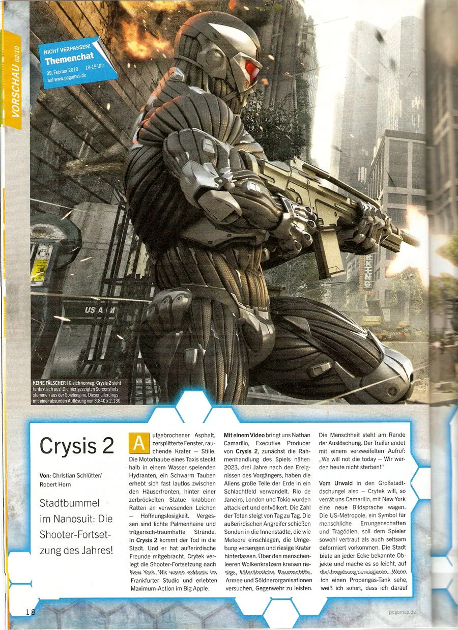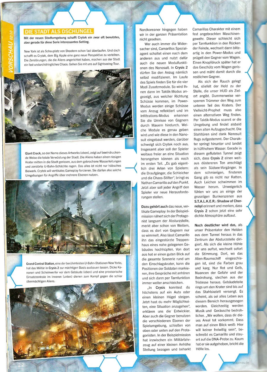 В сети появились сканы Crysis 2 из февральского номера немецкого журнала PC Games. Если вы знаете немецкий язык, то сможете узнать много нового об игре. Crysis 2 разрабатывается для ПК, PS3 и Xbox360. Дата выхода неизвестна.