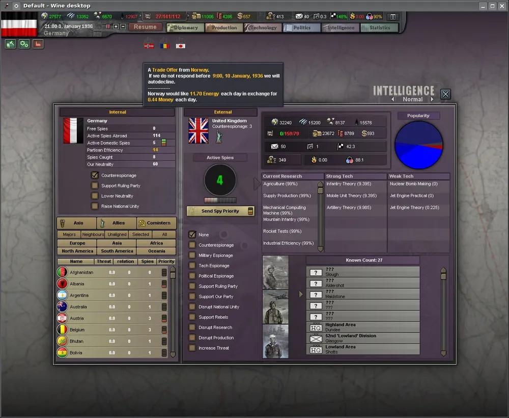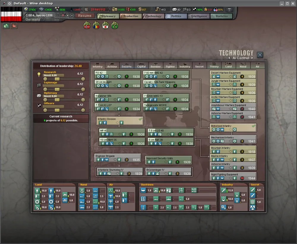 Возможность исследовать отдельные области технологий (и эффективность таких исследований) теперь напрямую зависит от показателя "лидерства". Воюешь - лидерство тебе капает. Сидишь тихо - не будет у тебя ни атомной бомбы, ни АУГ, ничего, в общем, не будет; несколько похоже на популярный мод C.O.R.E., только более динамично. Выглядит такой подход неправдоподобно и в целом отвратительно; кроме того, у США "лидерство" изначально большое, а у СССР изначально маленькое, что есть сугубый бред. Возможно, я просто не до конца разобрался в ситуации.