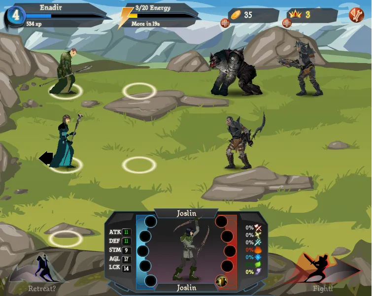 Бой пошаговый: под каждым персонажем высвечивается количество сердечек жизни и кристаллов энергии, а внизу шкала инициативы. На каждом ходу можно использовать один предмет, вроде аптечки или гранаты и один скилл, вроде молнии у мага, стрелы, бьющей врагов в ряд у разбойника или щита у воина, увеличивающего его защиту.