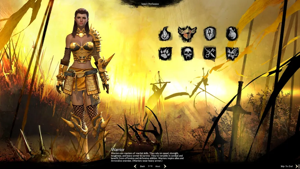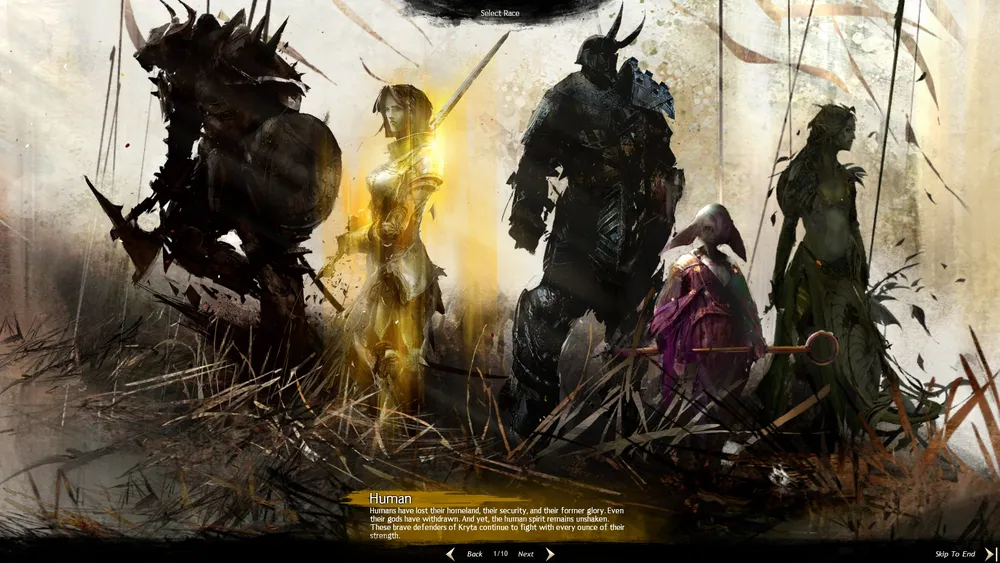 Из представленных 5 рас (Human, Charr, Norn, Sylvari, Asura) я выбирал между Human и Asura. Недолго думая, я выбрал Человека девочку. Далее перед моими глазами представился выбор класса. Все персонажи тут представлены в энд-гейм броне, которая выглядит очень неплохо. Я не стал раздумывать (ибо я знал еще с бета-уикэндов, кем я буду играть) и выбрал класс Guardian. Это нечто похожее на Паладина (из всем нам известного гиганта MMO) с замашками кастера, но и прекрасно себя чувствующего в мили. Так же в игре представлены и другие классы, где каждый найдет себе персонажа по нраву: