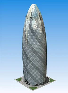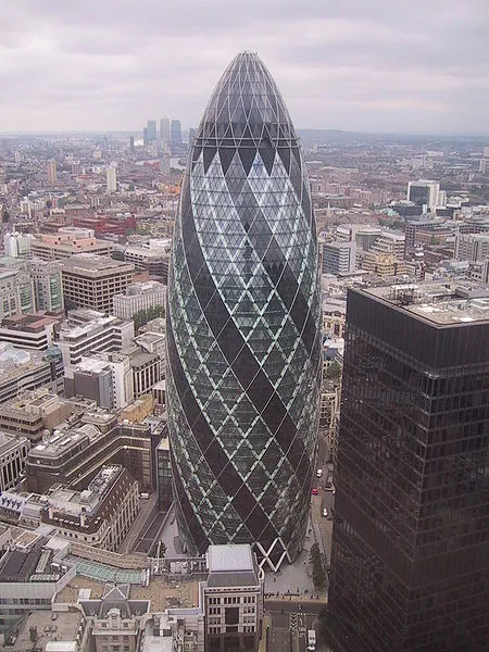 По прозвищу "Корнишон", лондонцами, этот 180-метровый небоскрёб, созданный Norman Foster towers для финансового района города. Это здание известно своей конструкцией и качеством экономии энергии.