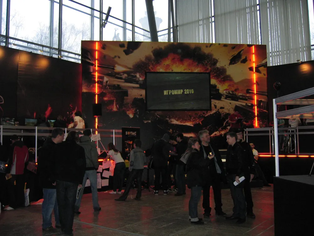 World of Tanks (а ведь при начале чтения их названия, я даже поверил в чудо), на стенде которых танцевали в "башнях" обворожительные девушки.