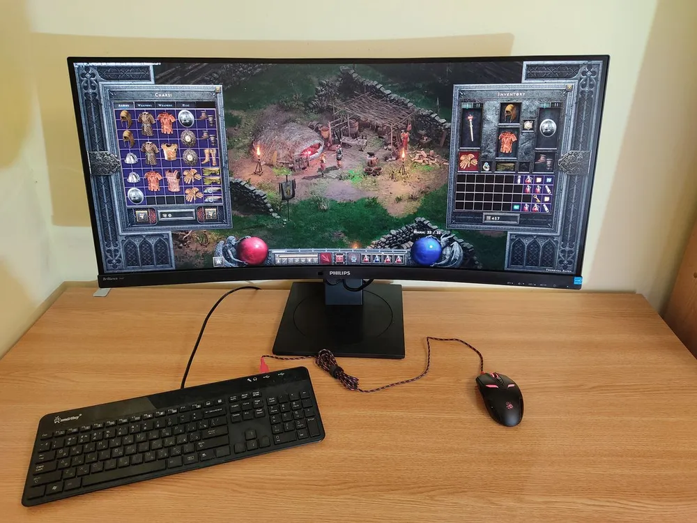 Сравнение с двумя рядом стоящими мониторами не всегда возможно, и дело не только в том, что в цельной панели не будет шва прямо по центру видимой области (между двумя мониторами он всегда есть, сколько бы ни говорили про безрамочный дизайн). Еще более заметная разница, например, в играх: современные трехмерные игрушки без проблем поддерживают разрешение 21:9, а вот задействовать два монитора сразу они способны очень редко. Ниже я снял в Diablo 2: Ressurected. Первый – на обычном Full HD мониторе, второй – на Philips Brilliance 346P.