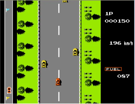 Итак, нам надо проехать все 4 маршрута до самого финиша. У вас есть шкала с топливом. За врезание в стены топливо дополнительно снимается. Основная задача – избегать столкновения и пополнять запасы топлива. Сама игра довольно короткая и является неплохим примером гоночной видеоигры с top-down перспективой. Но в тоже время, игра крайне простенькая, даже по меркам системы NES.