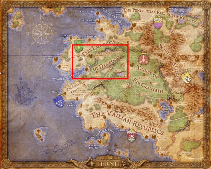 Немного о мире игры. Мир, в котором происходит действие “Pillars of Eternity”, называется Иора (Eora) и состоит из континента и множества островов, включая Восточный край, где и разворачивается вся история. Помимо людей, этот мир населяют и другие расы. Кроме магии, там существуют зачатки технологии, представленные огнестрельным оружием уровня XVI века. Карта Иоры представлена ниже, красным прямоугольником на ней выделена область, где происходит действие игры.