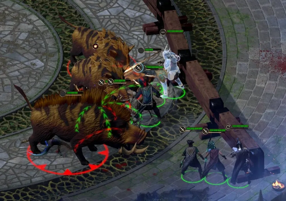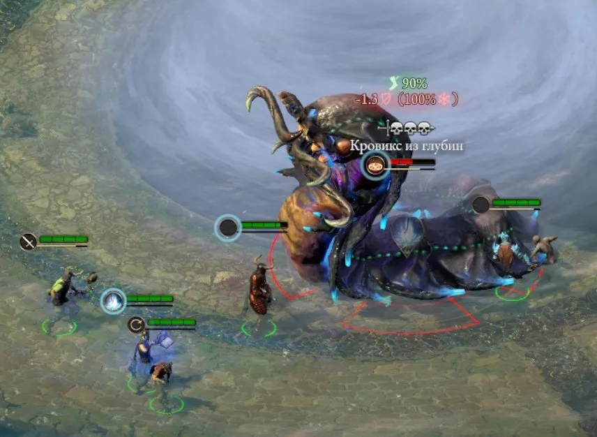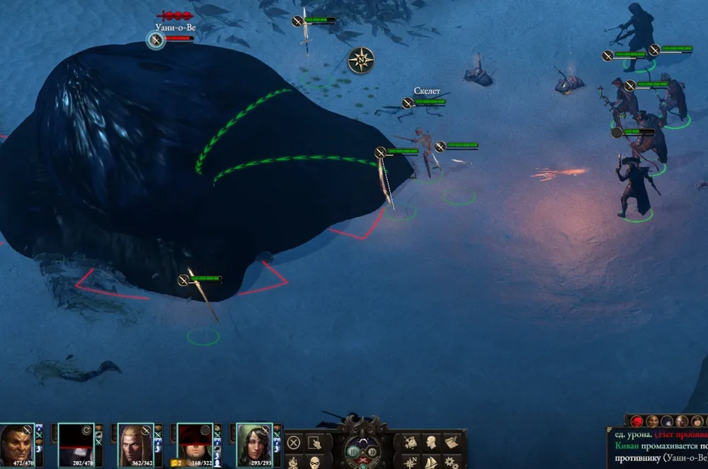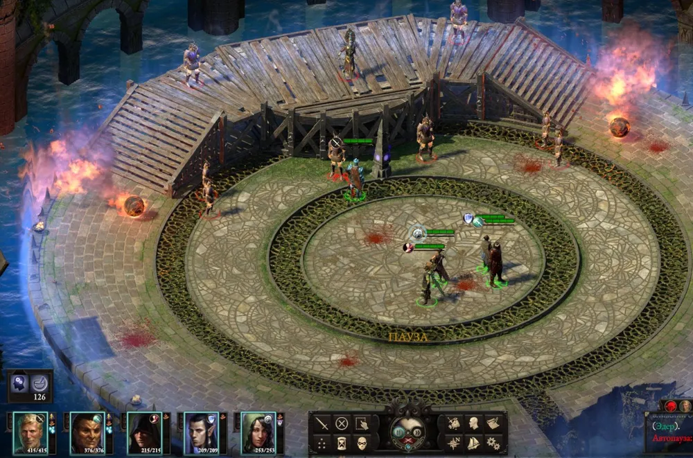 Какие-то призраки проводят непонятные ритуалы, беседуют друг с другом, а завершается всё сражением с убивающим и выживающим (если я правильно понял). Причём поединок с особой женского пола оказался невероятно тяжёлым (напоминаю – на самом лёгком уровне сложности!); она дважды полностью восстанавливала своё здоровье – под атаками всей партии и нескольких призванных союзников. Возвращаемся на арену, здесь очередное нападение: приплыл гигантский крокодил;