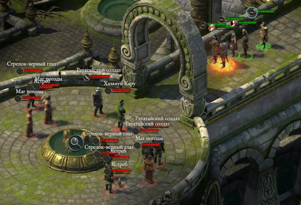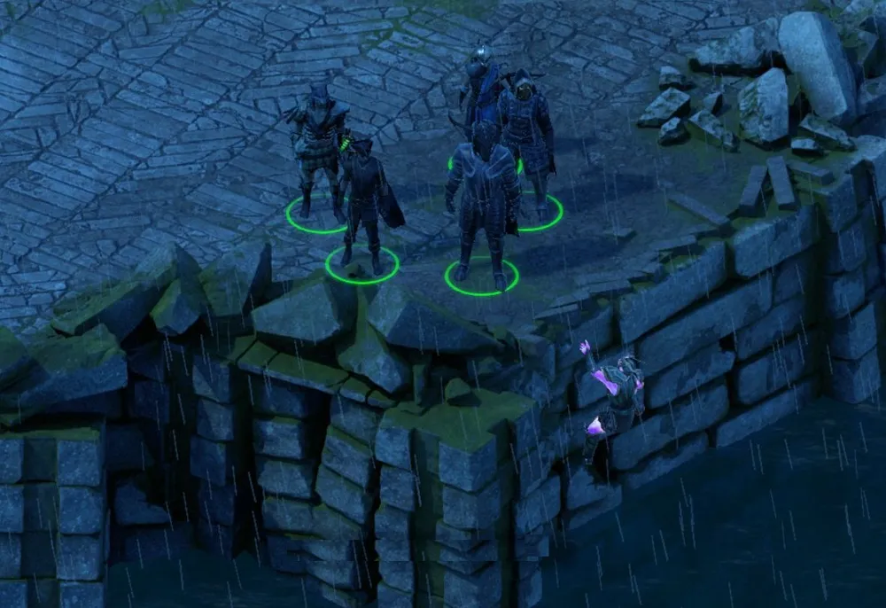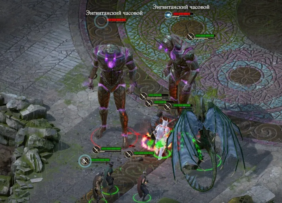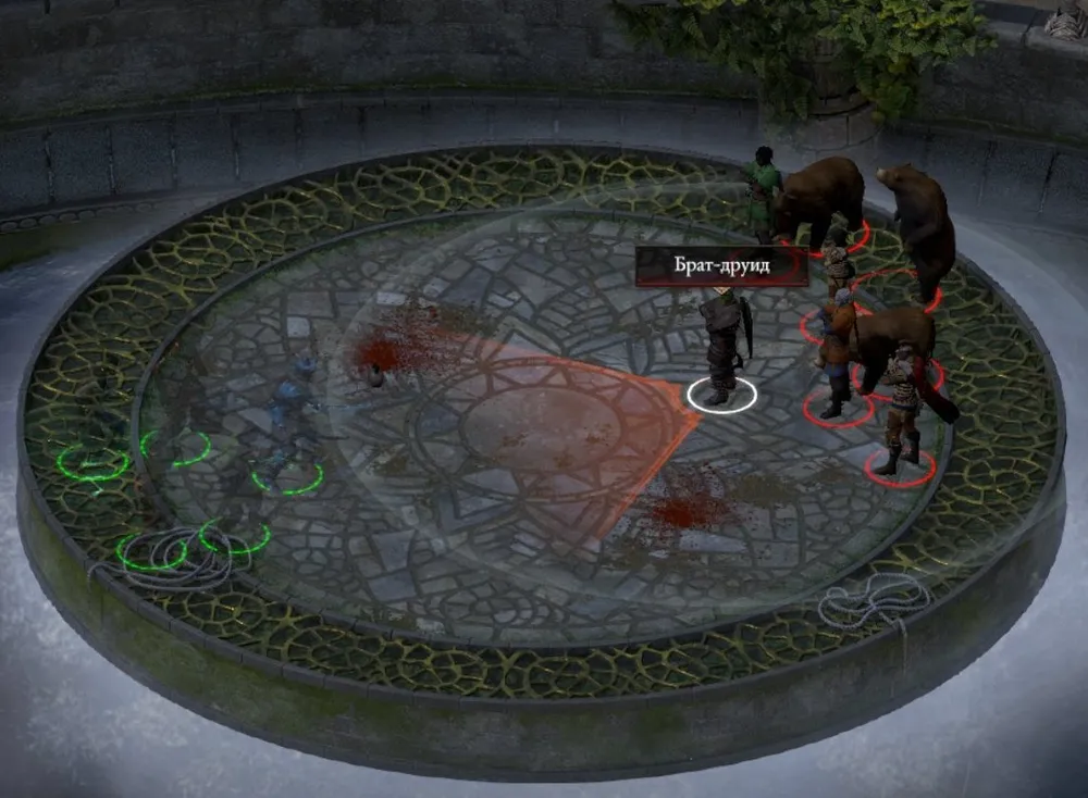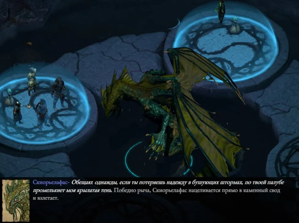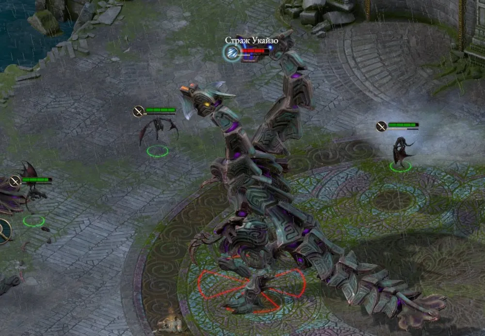 Призванные отвлекают стража (пока что у него одна голова), отряд занимается адровыми воинами. Перебили? Быстро вперёд, мимо двух статуй, как можно дальше от стража! Если всё будет как надо, он замрёт на месте в центре пристани – потеряет отряд из виду. Начинается работа певчего и его призванных…