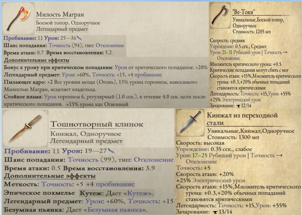 К слову, магическое оружие и доспехи второй части улучшаются в основном за счёт дополнительных свойств. Причём эти свойства взывают, мягко говоря, удивление или даже нервный смех. Давайте сравним кинжал и топор из разных частей.