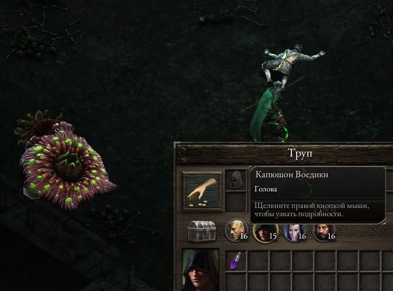 в месте под охраной «грибов и цветов» находим труп, с головы которого снимаем капюшон Воедики.