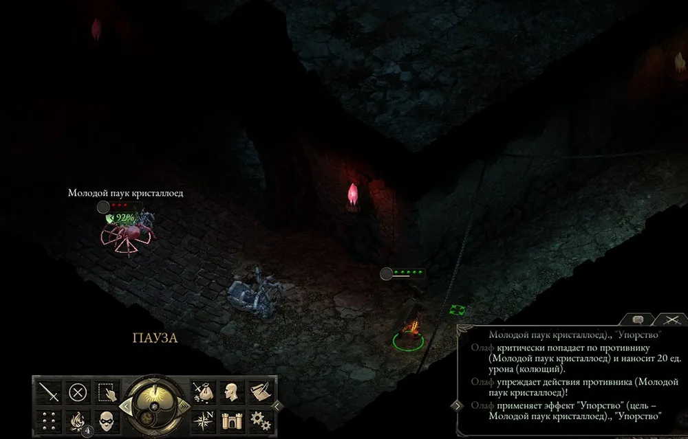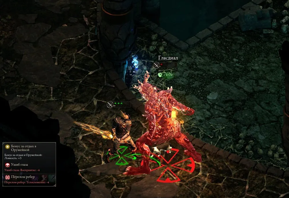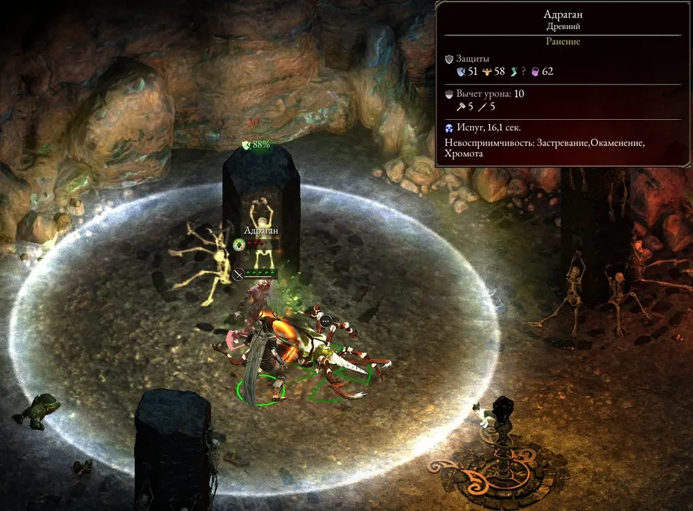 Уничтожил, добрался до спуска, и… Я так и знал – дракон (благодаря уровню игры в его свите всего лишь два ксаурипа, но и этого хватает). Ближний бой – ему достаточно одного удара или выдоха пламени. Значит, лук. Призываю союзников, чтобы тормозили огнедышащую тварь и осыпаю его стрелами, постепенно отбегая. Довёл до состояния «Тяжёлое ранение» и погиб, зато узнал, от чего защищена ящерица-переросток. Сбегал наверх, усилил лук разъедающим уроном, добавил бонус к атаке по животным.