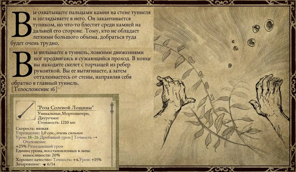 Заодно, раз уж оказался рядом, решил выяснить, что скрывается в подземном потоке. Понадобилось изменять характеристики пять раз (1500 золота и ещё столько же на возврат) прежде, чем удалось отыскать необходимое значение (не забудьте сохранить игру перед изменениями!). Моему персонажу данное оружие не подходит, для продажи также не годится из-за малой стоимости.