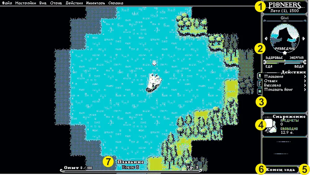 1 – дата. 2 – панель персонажа (профессия, показатели здоровья, энергии, еды и воды). 3 – панель действий, параметров, навыков (переключаются кнопками). 4 – панель снаряжения. 5 – кнопка прокладки курса. 6 – кнопка “Конец хода”. 7 – шкала плавания.