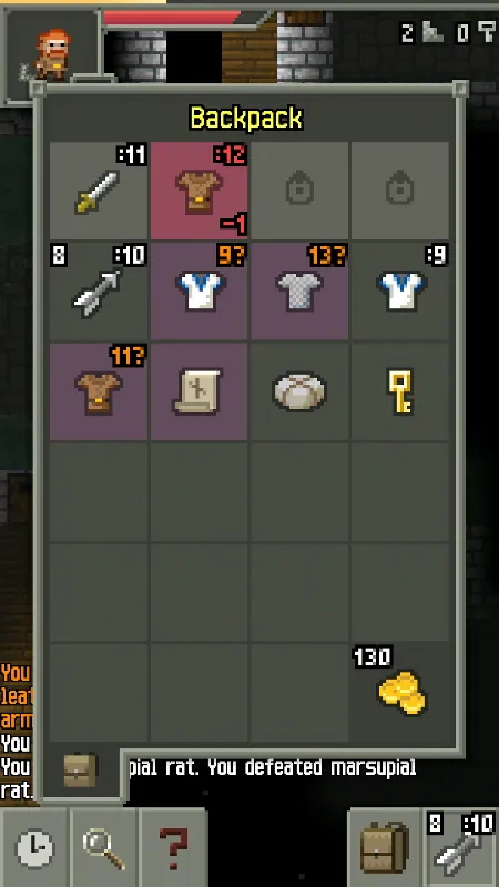 Интерфейс дружелюбен, комфортен в использовании. Сверху нам показывают наши жизни, наш уровень и номер этажа в подземелье. Снизу – более крупные иконки инвентаря, характеристик и т.д. А также есть лог всех событий. Подобрали с пола лечилку – тут же увидите информацию об этом.