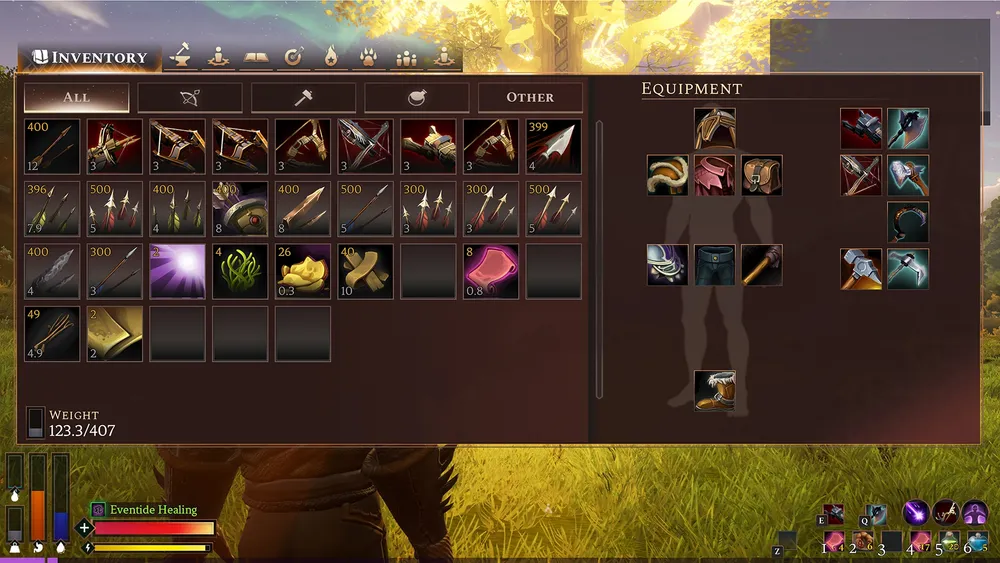Четвертый пункт плана развития Rend’а – интерфейс пользователя, который был полностью переработан в течение тестирования альфа-версии Rend’a. То, что начиналось с монохроматических окон с неправильными пропорциями, превратилось в цельный проект, который отражает смелую цветовую палитру игры, отображая важную информацию в удобном для усвоения формате, объединяя в себе лучшие практики из RPG, MMO и жанра выживания. Ниже будет представлен набор скриншотов демонстрирующих новый интерфейс: радиальное меню, инвентарь персонажа, вкладку исследований, вкладку крафта, и окно усовершенствования.