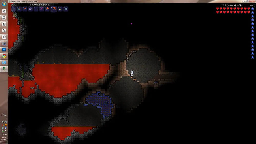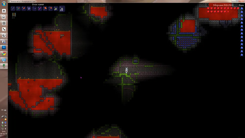 Смеркалось, плюс ко всему мы наткнулись на камень внутри планеты, за которым не было видно абсолютно ничего. Факел мне, факел! - закричал брат! И только сейчас я задумался.. Я стоял в абсолютно чёрной комнате, мял в ладонях ещё прохладный гель и поражался тому, что на планете не росло ни единого дерева! Поднимаемся! - среагировал я, чудом увернувшись от упавшего в шахту зомби. Выбравшись на поверхность планеты, мы немного передохнули, меланхолично отгоняя нечисть от входов в тоннели. Я даже смог выбить киркой линзу из особо назойливого глаза..