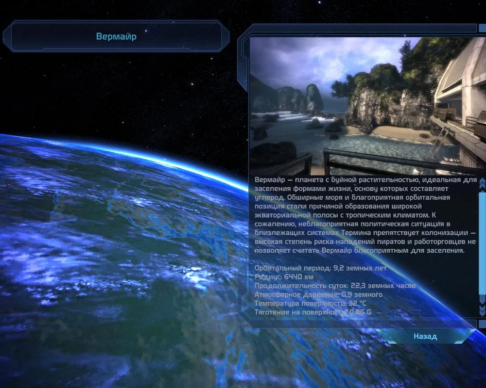 Планета с буйной растительностью, идеальная для заселения формами жизни, основу которых составляет углерод. Обширные поля и благоприятная орбитальная позиция стали причиной образования широкой экваториальной полосы с тропическим климатом. К сожалению, неблагоприятная политическая ситуация в близлежащих системах Термина препятствует колонизации – высокая степень риска нападений пиратов и работорговцев не позволяет считать Вермайр благоприятным для заселения.