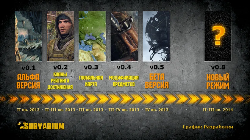 Vostok Games опубликовала на официальном сайте Survarium график разработки игры на этот год. Согласно ей, альфа версия игры будет тестироваться начиная уже со второго квартала 2013 года, а в статус бета версии перейдет уже в конце года.