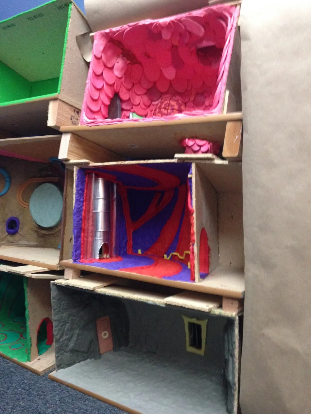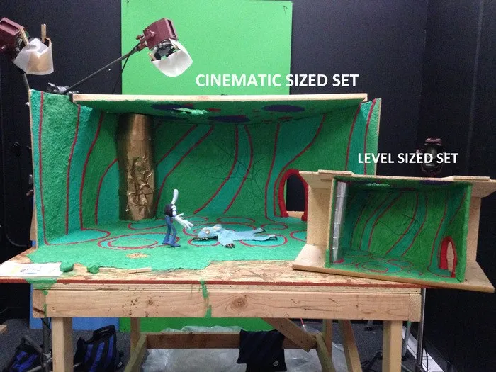 В данный момент продолжается процесс замены чернового анимационного материала на чистовой, отснятый на камеру. Также начато строительство декораций специально для внутриигровых видеороликов. На картинке выше вы можете увидеть две одинаковые комнаты: та, что покрупнее, используется для съёмки ролика, а та, что поменьше, использовалась как игровой уровень. Большие декорации используются для того, чтобы анимировать полноразмерных героев прямо внутри них, а также чтобы показать больше деталей.