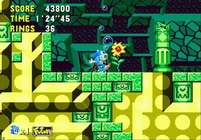 Между тем, Sonic CD по части реализованных инноваций превосходит абсолютно любой советский НИИ. По свежей концепции каждый акт теперь может проходить в различных временных периодах. Чтобы получить хорошую концовку, Сонику надо пробежать на всем ходу мимо специальной таблички, попав тем самым в захваченное чокнутым доктором прошлое, и там уничтожить находящийся где-то на просторах зоны роботоризатор зверушек. При этом будущее (в которое герой также мог «прибежать» посредством указателя), в зависимости от успеха этого дела могло быть хорошим или плохим – отчего роботы-бадники становились агрессивнее или, наоборот, дряхлее. Идея с перемещением оказалась насколько гениальной, настолько и ломающей скоростной геймплей, переключающей его в исследовательскую сторону. Поэтому в будущем от нее отказались, чтобы упростить игрокам задачу.