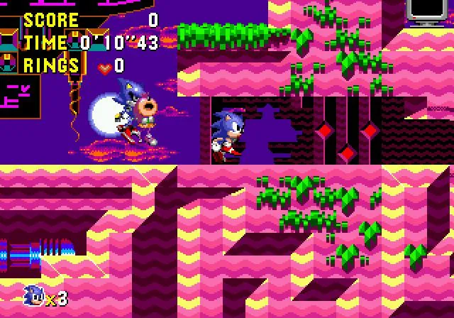 Выкинули в последовавших частях и новое движение Соника – разгон с места. Этот прием, в отличие от Spin Dash, не позволял убивать врагов, но перемахивать сходу через пропасти очень даже помогал. Скорее всего, причина расставания с ним была та же – чистота изначально работающей формулы. Зато от подруги протагониста отказываться уже не стали. Идея ввести девочку-ежика лежала на поверхности, удивительно, что дошли до нее только через два года, но именно в Sonic CD дебютировала Эми Роуз, розовая, в юбке, и еще без молотка. Ее, конечно надо было вырывать у черепах из негодяйских лап, в роли похитителя предлагался еще один новичок – Металлический Соник, позже ставший привычным боссом.
