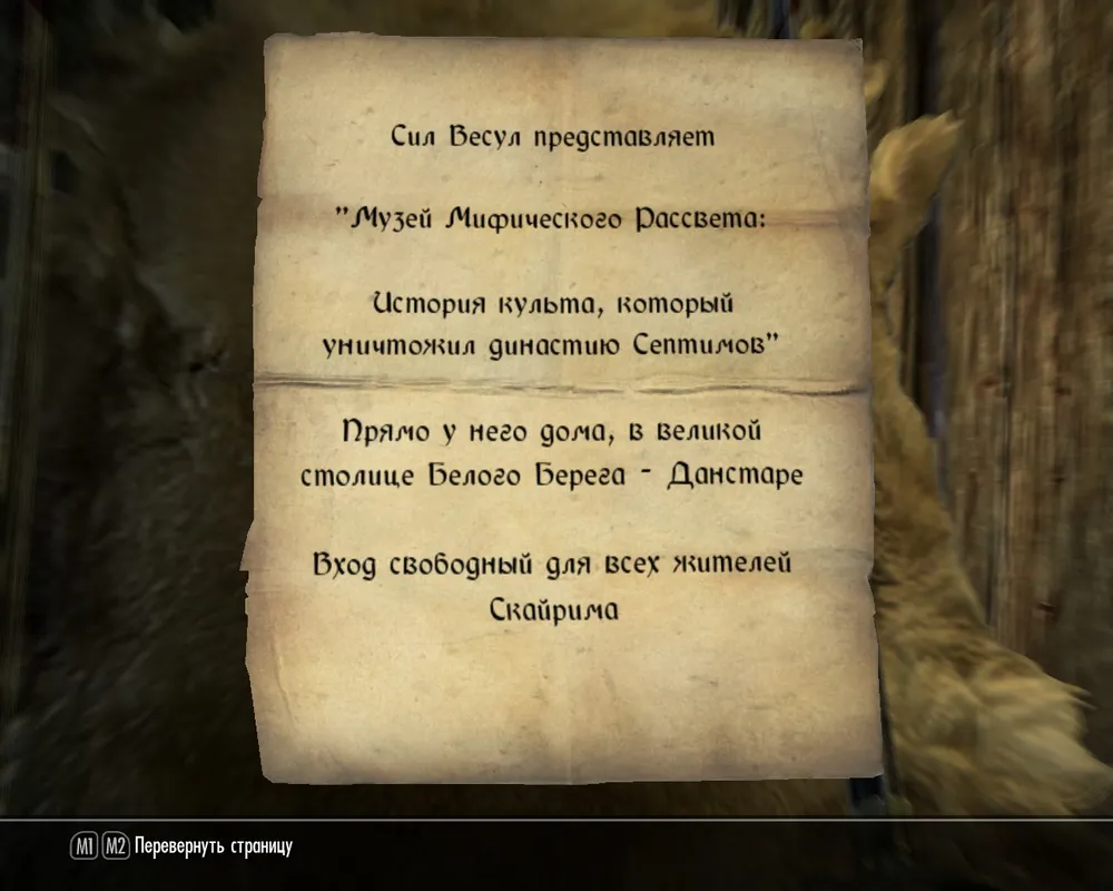 Достигнув 20 уровня, посетите любой из городов Скайрима. К вам подбежит гонец. Он вручит вам рекламную листовку, в которой говорится, что некто Сил Весул в Данстаре открыл музей, посвящённый Мифическому рассвету.