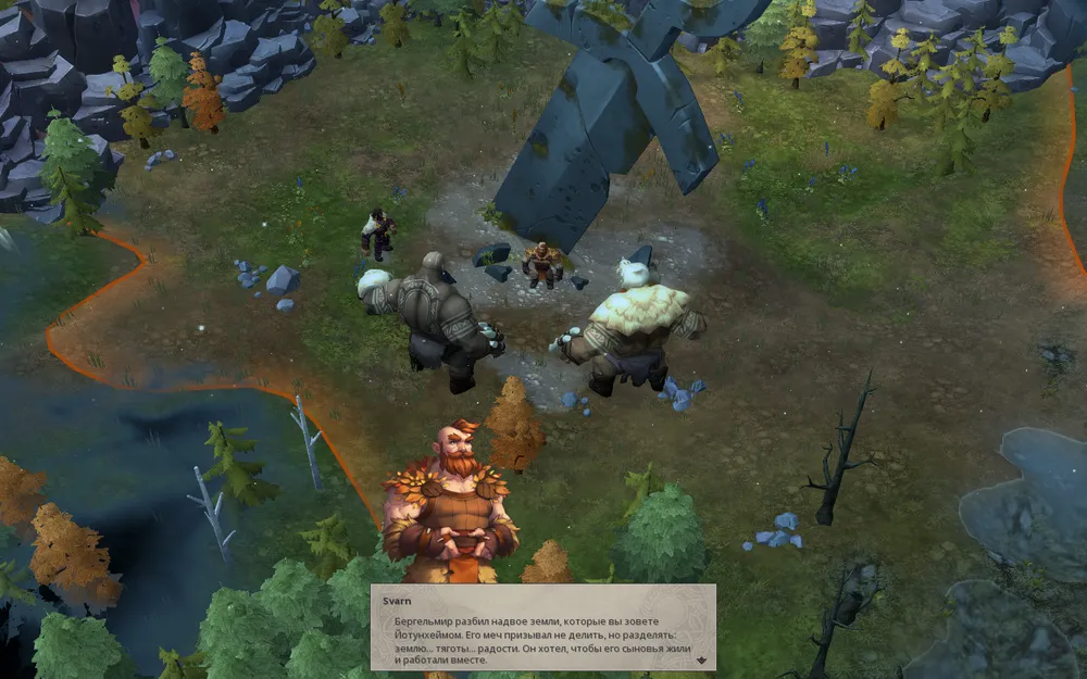 Как только мы исследовали предания йотунов, в дело вступает Сварн и преподносит йотунам красивую легенду о взаимопомощи и дальнейшей совместной деятельности. Растрогавшиеся предводители обоих групп мирятся и пропускают нас дальше.