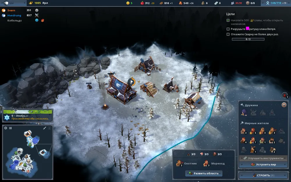 К июню третьего года Сварн попросит у нас 150 единиц древесины, выполнив просьбу, строим в зоне 5 торговый пост, открыв там продажу еды или древесины (в зависимости от того прирост какого ресурса выше), например с обнаруженными нашими разведчиками кобольдами. Для повышения счастья клана строим здесь же пивоварню. Добытое железо с каменоломни в зоне 5 пускаем на улучшение инструмента наших работников, рекомендую следующий порядок улучшений (по мере добычи): охотники, лесорубы, мореходы, крестьяне.